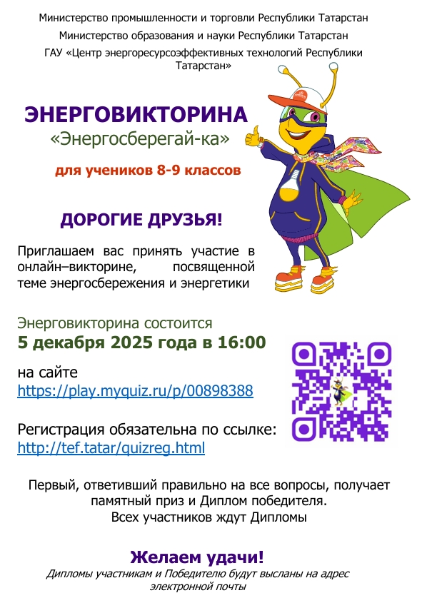 Для участия в мероприятии необходимо пройти регистрацию по адресу: clck.ru/35vZ5q#ВместеЯрче - 2025 Бөтенроссия энергияне сак тоту һәм экология фестиваленең социаль кампаниясе кысаларында Татарстан Республикасы сәнәгать һәм сәүдә министрлыгы «Татарстан Республикасы Энергия ресурсларының нәтиҗәле технологияләре үзәге " ДАУ белән берлектә интеллектуаль-танып белү мәктәп укучылары катнашында «энергияне сак тоту һәм энергетика» темасына «Энергосберегай-ка» энерговикториналары . Энерговикторина Татарстан Республикасында энергияне саклый торган яшәү рәвешен пропагандалау һәм популярлаштыру, энергетиканы үстерү, ягулык-энергетика комплексы һөнәрләрен популярлаштыру максатларында үткәрелә. Энерговикторинаның бурычы-укучыларны энергияне сак тоту һәм энергетика темалары белән таныштыру, шулай ук табигать ресурсларына сакчыл мөнәсәбәтне өйрәтү. ЭН Энерговикторина 2025 елның 5 декабрендә 16:00 сәгатьтә 8-9 сыйныф укучылары арасында онлайн форматта электрон мәйданчыкта узачак: clck.ru/3QYNph. ️Чарада катнашу өчен түбәндәге адрес буенча теркәлү узарга кирәк: clck.ru/35vZ5q