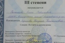 Сегодня в НПК "Шаги в науку " (Балтаси) наша ученица Рыжикова Олеся заняла 3 место. Руководитель: Зарипова Т.Т. Поздравляем!