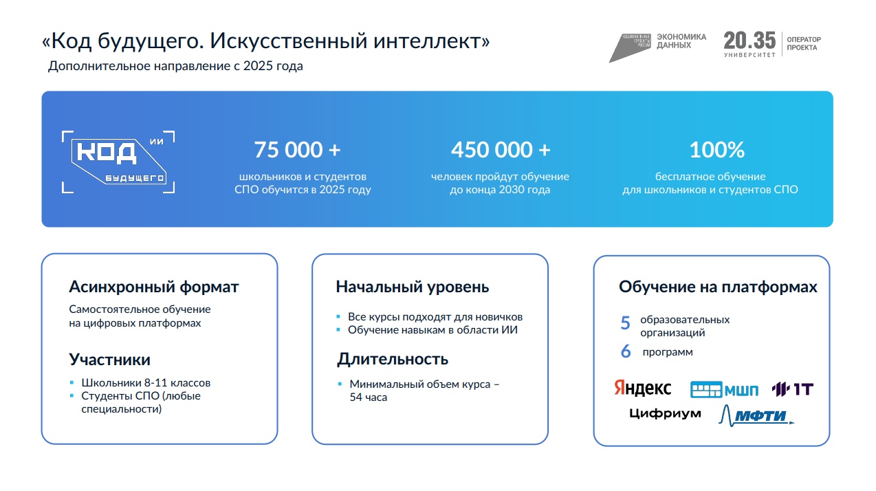 Минцифры России информирует, что в настоящее время на портале федеральной государственной информационной системы «Единый портал государственных и муниципальных услуг (функций)» осуществляется прием заявлений на участие в проекте «Код будущего.Искусственный интеллект». Ознакомиться с полным перечнем образовательных организаций (провайдеров) и курсов, а также подать заявление на участие в проекте можно на сайте проекта на ЕПГУ по адресу clck.ru/3M5VSc.