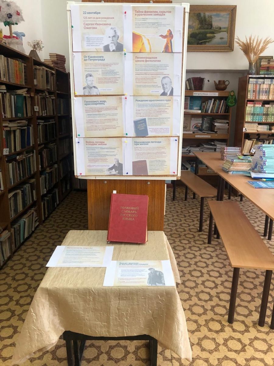 Имя Сергея Ивановича Ожегова принадлежит к тому счастливому кругу имен, которым суждена долгая жизнь, широкая известность и поистине всенародная любовь. С. И. Ожегов стал тем, кого в других странах с любовью и гордостью называют «человек-словарь».Сергей Иванович Ожеговның тууына 125 ел тулу уңаеннан мәктәп китапханәсендә «туган телне саклаучы»күргәзмәсе оештырылган. Сергей Иванович Ожегов-атаклы галим, атаклы ликолог һәм лингвист, үз халкының телен генә түгел, тарихын, мәдәниятен, этнографиясен дә яхшы белүче. Аның исеме танылган тел белгечләре Владимир Иванович Даль һәм Дмитрий Николаевич Ушаков белән бер рәттә тора. Сергей Иванович Ожегов исеме озын гомер, киң танылу һәм чын мәгънәсендә бөтен халык мәхәббәте язган Бәхетле исемнәр даирәсенә карый. С.и. Ожегов башка илләрдә ярату һәм горурлык белән «кеше-сүзлек»дип йөртелгән кешегә әверелә.