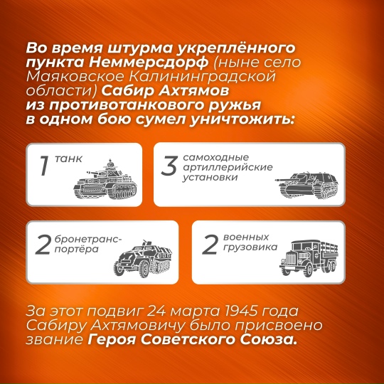 На репетиции парада Победы один из офицеров не хотел допускать младшего сержанта Ахтямова в строй из-за роста ниже 170 см, но командир сводного полка, увидев ордена на груди Сабира, воскликнул «Такого орла да не взять!».Подробнее о жизни и подвиге Сабира Ахтямовича Ахтямова читайте в наших карточках.