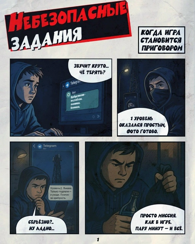«Гади биремне үтәң-акча ал», - бу фраза артында җинаятьчел схема яшеренергә мөмкин. Беренче биремнәр зарарсыз булып күренә: фотога төшерү, нәрсәдер санау, шәрехләр калдыру. Аннары биремнәр башкага әйләнә: әлеге объектка ут төртү яки аны бозу. Баланы җинаятькә тартып, шантажларга, куркытырга мөмкиннәр. Моны комикста күрсәтәбез. Укып чыгыгыз һәм аны балалар белән бергә тикшерегез.