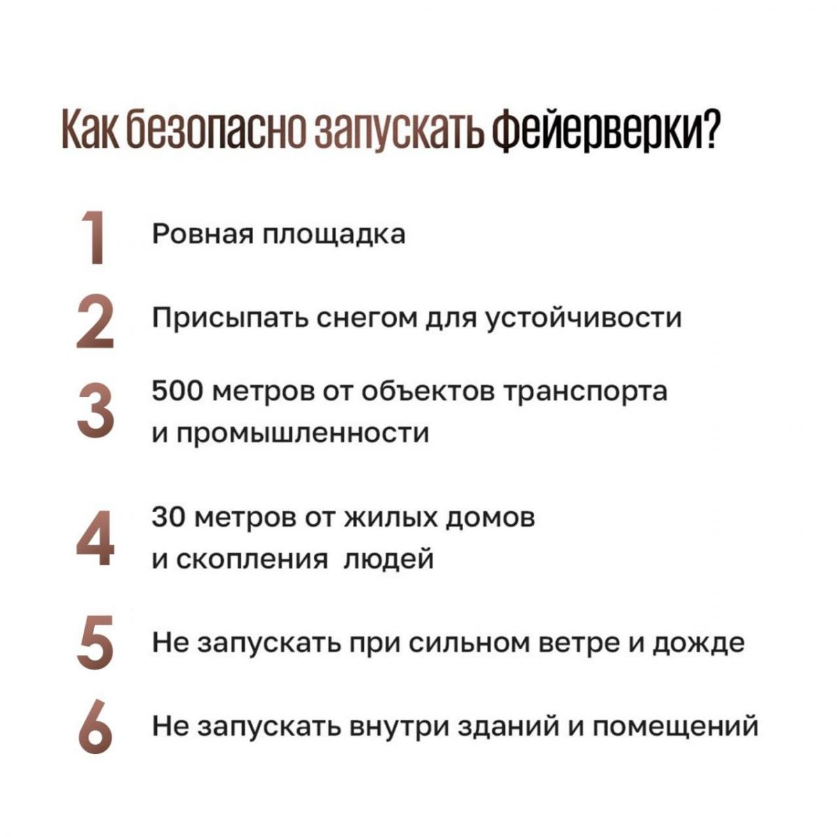 ✔️Применять пиротехнические изделия можно только на специальных площадках или на определенном расстоянии от объектов промышленности, транспортной инфраструктуры, топливно-энергетического комплекса, объектов с массовым пребыванием людей, домов, дорог.