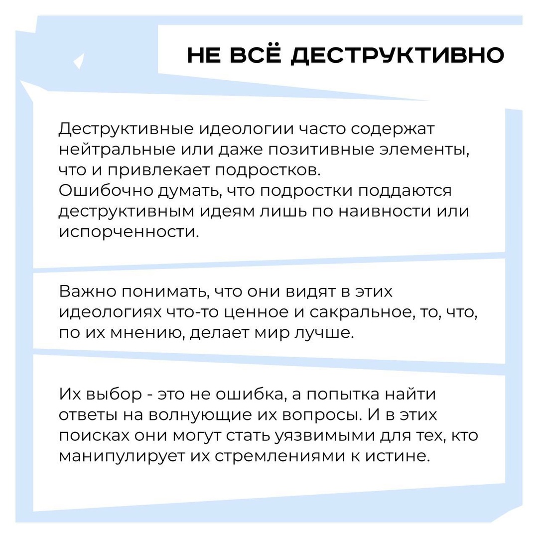 Подписывайтесь на канал Родителям о важном! (https://t.me/secureyourchild) для рекомендаций по профилактике радикализма среди молодежи и других актуальных тем.Деструктив идеология-ул үзендә җимергеч нәтиҗәләр китерә торган кыйммәтләр системасы. Гадәттә ул гаделлек яки җәмгыятьтә үзгәрешләр идеяләре белән кешеләрне үзенә тарта. Яшүсмерләр арасында деструктив идеологияләрне нәтиҗәле профилактикалау өчен комплекслы якын килү мөһим, барысы да беренче карашка тоелганча ук гади түгел бит. Бу язмада сезгә бу күренешнең төп, ләкин кайчак сизелми торган аспектларының берничә мисалын китерик. ___ Күбрәк файдалы материаллар Мөһим нәрсәләр турында әти-әниләрегезгә каналга язылыгыз! (https://t.me/secureyourchild) яшьләр арасында радикализмны профилактикалау буенча тәкъдимнәр һәм башка актуаль темалар өчен.