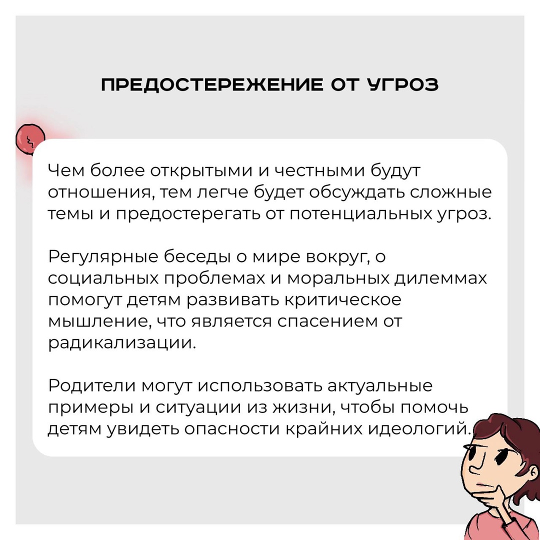 В условиях, когда радикальные идеи могут легко проникать в умы подростков, доверительный диалог становится ключевым элементом, позволяющим обсуждать сложные темы, выявлять тревожные изменения в поведении и противостоять возможному влиянию экстремистских взглядов.