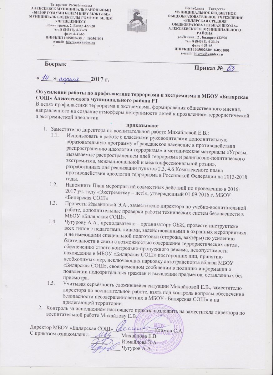 Приказ №231 от 1.09.2018 года "Об усилении работы по профилактике терроризма и экстремизма"