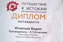 С целью привлечения молодежи к реализации инновационных туристских проектов развития и продвижения туристских центров Республики Татарстан, воспитание чувства патриотизма через повышение осведомленности молодежи о туристских ресурсах родного края, его культурных и экологических памятниках прошел VIII республиканский конкурс "Путешествие к истокам"-2017. Торжественное награждание состоялось 29 ноября 2017 года.Дипломантом конкурса стал Игнатьев Вадим, ученик 9 класса. Поздравляем Вадима и руководителя Игнатьеву Е.Т.