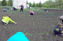 Члены пришольного лагеря труда и отдыха ухаживают за посевом лука.
