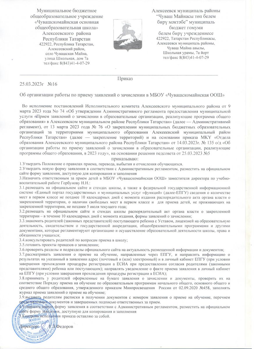 Постановление №74 от 09.03.2023 "Об Административном регламенте предоставления муниципальной услуги "Прием заявлений о зачислении в образовательные организации,реализующие программы общего образования" в Алексеевском муниципальном районе Республики Татарстан"