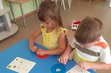 Педагог учила детей составлять простой узор из элементов народного орнамента, закрепила с ребятами приём примакивания, ритм: слева - справа - между ними. В ходе занятия у детей развивалось цветное восприятие.