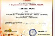 Воспитанница нашего детского сада Беликова Ульяна заняла 1 место в конкурсе аппликаций в номинации "Весёлый львёнок". Поздравляем Ульяну, её родителей и воспитателя Богатову О.Н.