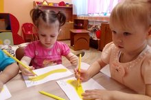 Дети учились рисовать красками воздушные шарики, продолжали знакомиться с круглой и овальной формой, цветами (жёлтый, красный, и зелёный).