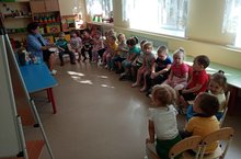 В младшей группе прошло занятие по развитию речи, на котором дети познакомились с буквой О и звуком О. Ребята помогали кукле, играли, а в конце занятия раскрасили букву О.