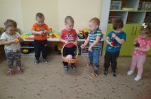 Ольга Анатольевна в ходе игры с дидактическим материалом формировала у детей цветовое восприятие, учила повторять отдельные слова: листья, летят, жёлтый, красный.