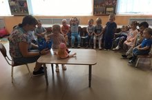 Наши самые маленькие детки, угощая куклу Катю, учились произносить слово "кушай", показывать и называть овощи.