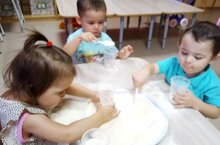 Для создания увлечённости воспитатель 2 нруппа раннего возраста предложила детям освоить новый материал для игры - манку. Работа с манкой помогает развитию зрительной координации, движению пальчиков рук, тактильные ощущения. Кроме того, игры с манкой оказывают успокаивающее действие на детей.