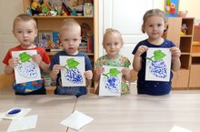 Сегодня на занятии по рисованию дети учились рисовать виноград, рисовали точки нетрадиционным способом - пальчиками.