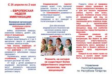 В соответствии с письмом руководителя Управления Роспотребнадзора по Республике Татарстан М.А.Патяшиной от 17.04.2021 № 07/10083 Министерство образования и науки Республики Татарстан сообщает следующее. По инициативе Всемирной организации здравоохранения в Европе, в том числе в Российской Федерации и Республике Татарстан в период с 26 апреля по 2 мая 2021г. проводится Европейская неделя иммунизации (далее ЕНИ-2021).Основная цель ЕНИ-2021 - повышение уровня знаний населения о важности иммунизации в предупреждении инфекционных заболеваний.