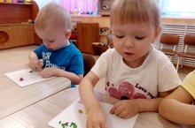 В рамках тематической недели "Я вырасту здоровым" дети второй группы раннего возраста продолжали учиться скатывать из пластилина шар круговыми движениями между ладоней (яблочки); различать красный, зелёный, жёлтый цвета.