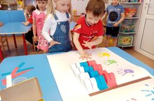 На тематической недели "Моя Россия - моя страна" и в преддверии праздника Дня России, дети средней группы сделали коллективную работу на тему "Флаг России в детских руках". Воспитатель Уздяева Н. А.