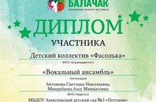 Воспитанники нашего сада, детский коллектив "Фасолька", приняли участие в Республиканском вокальном конкурсе-фестивале "БАЛАЧАК", руководители Антонва С.Н. и Миндубаева А.М.