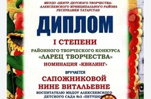 Подведены итоги районного конкурса "Ларец творчества". Поздравляем педагога Сапожникову Н.В., воспитанников Куянову А. и Гизатуллину А., руководителей Ситдикову Р.Р. и Фомину Н.А. с победой в конкрсе.