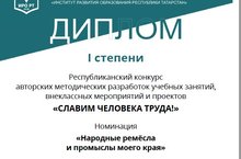Педагог нашего детского сада, Сапожникова Н.В. и старший воспитатель Шалкинская Н.А., участвовали в Республиканском конкурсе авторских методических разработок и учебных занятий «Славим человека труда» в номинации «Народные ремесла и промыслы моего края», организованного МОиН РТ и ДПО «ИРО РТ» и заняли первое место