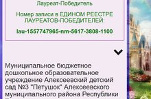 Подведены итоги мероприятия «Всероссийская выставка-смотр "Детский сад: мир любви, заботы и внимания"». В мероприятии приняли участие 14667 участников. Участники определены в следующие номинации: активные участники и победители.Наш детский сад стал Лауреатом-Победителем (номер записи в едином реестре лауреатов-победителей: lau-1557747965-nm-5617-3808-1100Поздравляю весь коллектив МБДОУ №3 «Петушок» с победой! Желаю ему дальнейшей плодотворной слаженной работы и новых побед! -
