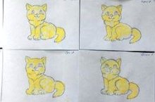 Педагог Синякова Е.Е. продолжает учить малышей узнавать и называть домашних животных. Дети рисовали следы кошки ватными палочками.