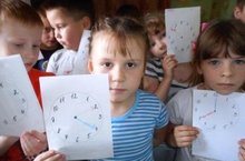 Дети подготовительной группы "Солнечные зайчики" знакомятся с часами. Учатся устанавливать время на макете часов. -