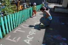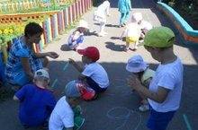 А у нас в руках мелкиЖелтые и красные!Нарисуем мы цветыСамые разные.Нарисуем синим цветомНеба яркого кусок.А для листьев на деревьяхЕсть зелененький мелок.В небе нарисуем солнце,В поле домик, в нем – оконце.И девчонку в ярком платье.Но рисунок на асфальтеОчень скоро дождик смоет.Это нас не беспокоит –Снова мы мелки достанем-Рисовать картину станем. -