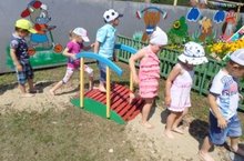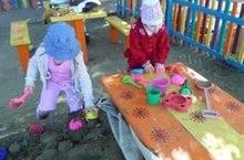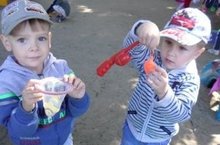 Гера замок строит ловко,Саша торт печёт ведёрком.Здесь, на участке на часокВсех детей собрал песок! -