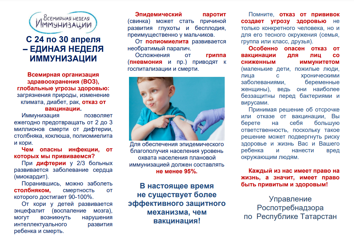Министерство образования и науки Республики Татарстан сообщает, что в период с 25 по 30 апреля 2022 года проводится Единая неделя иммунизации. Основная цель ЕНИ-2022 – повышение уровня знаний населения о важности иммунизации в предупреждении инфекционных заболеваний.