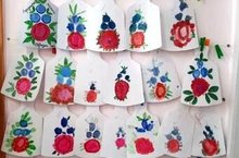 Воспитанники старшей группы "Смешарики" на рисовании расписывали "деревянные" доски Городецкой росписью.