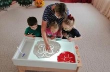 В детском саду "Солнышко" воспитатели Вафина Н.А., Сарапкина И.Н., Шарова Т.А. провели мастер - класс "Солнечная сказка на песке", с использованием светового стола и цветного песка с целью развития познавательный процессов, воображения, мелкой моторики.