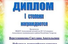 Педагог старшей группы Веретенникова С.А. победитель Всероссийского конкурса "Основы безопасности жизнедеятельности". Номинация "Дорожная безопасность". Название работы "Светофор".