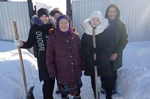 В рамках месячника патриотического воспитания учащиеся 9 класса очистили от снега территорию дома Ивановой З. А.