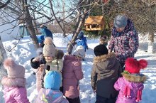 После беседы о зимующих птицах дошкольники с удовольствием наполнили зерном кормушки для птиц и развесили сало для синичек.