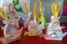 По шаблону дошкольники вырезали из бумаги,раскрасили, склеили скворечники для птиц.