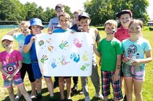 На память о лагере воспитанники оставили свои яркие впечатления в виде своих ладошек и получился замечательный плакат "Дружба , как солнце ярче свети"