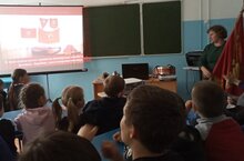 Учащиеся начальных класов посетили школьный музей и познакомились с атрибутикой пионерии. Учитель истории показала барабаны, горны, флаги которые находятся в музее.