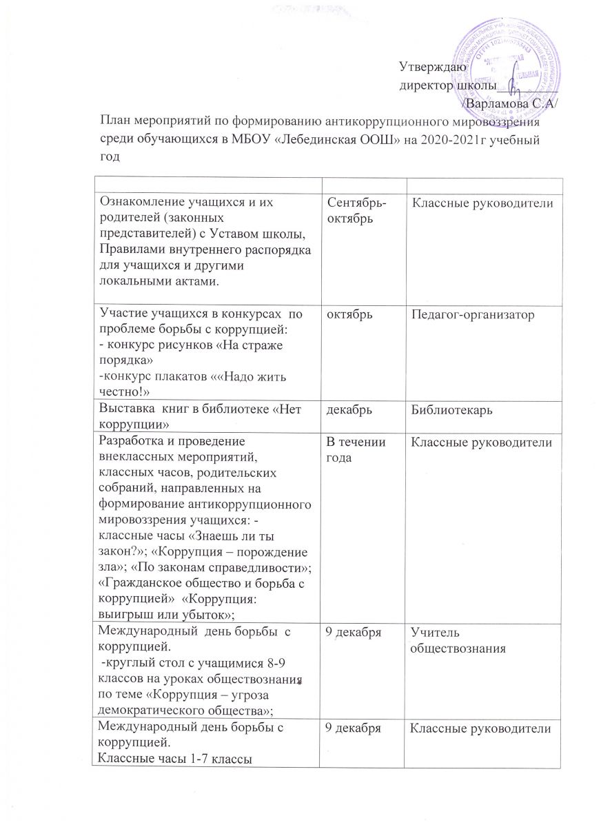План меропрятий по формированию анткоррупционног мировозрения среди учащихся