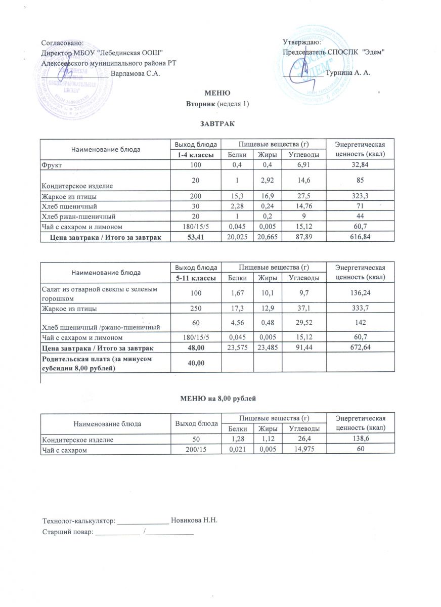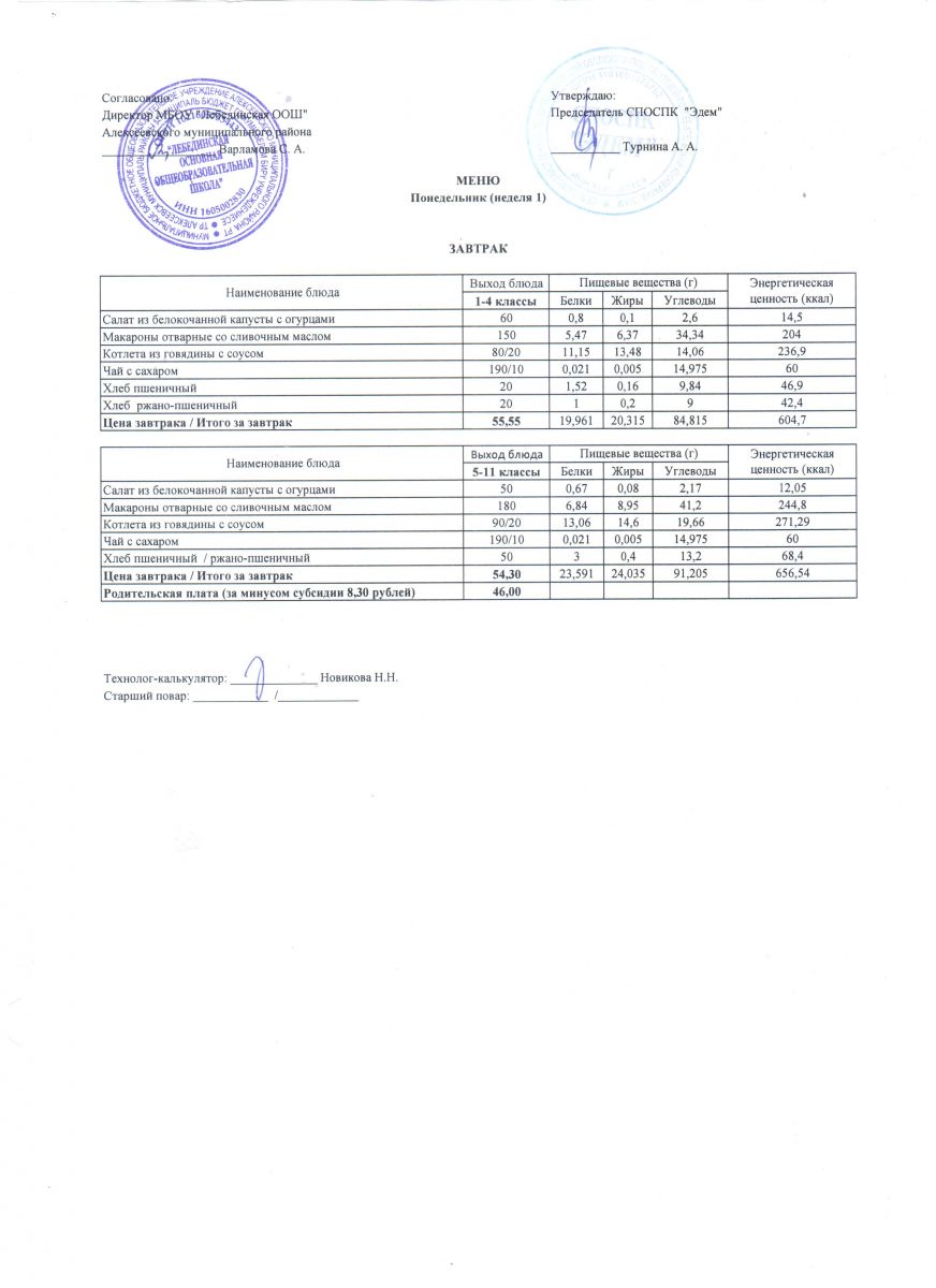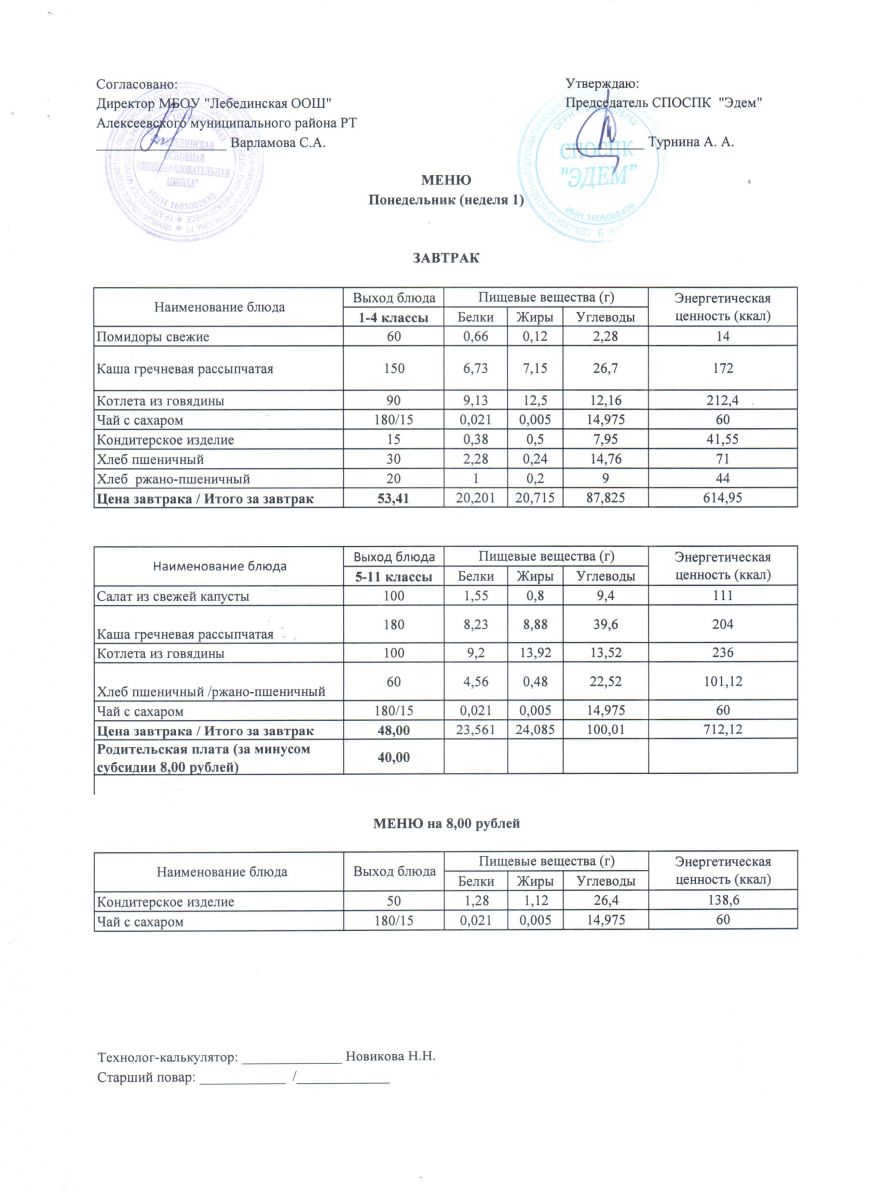 Меню по школьной столовой на понедельник 1 неделя 2021.