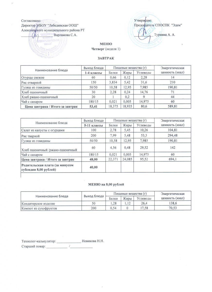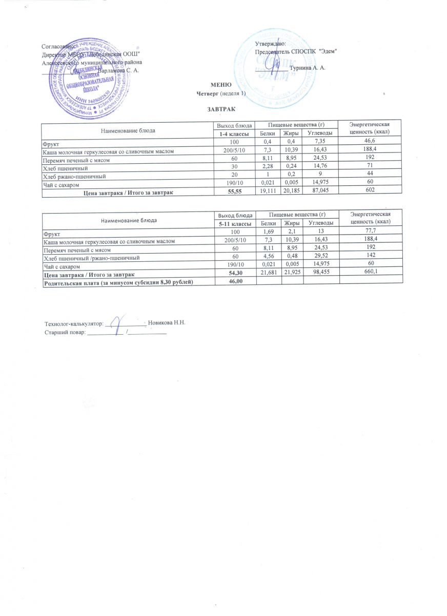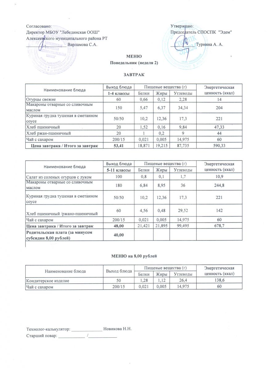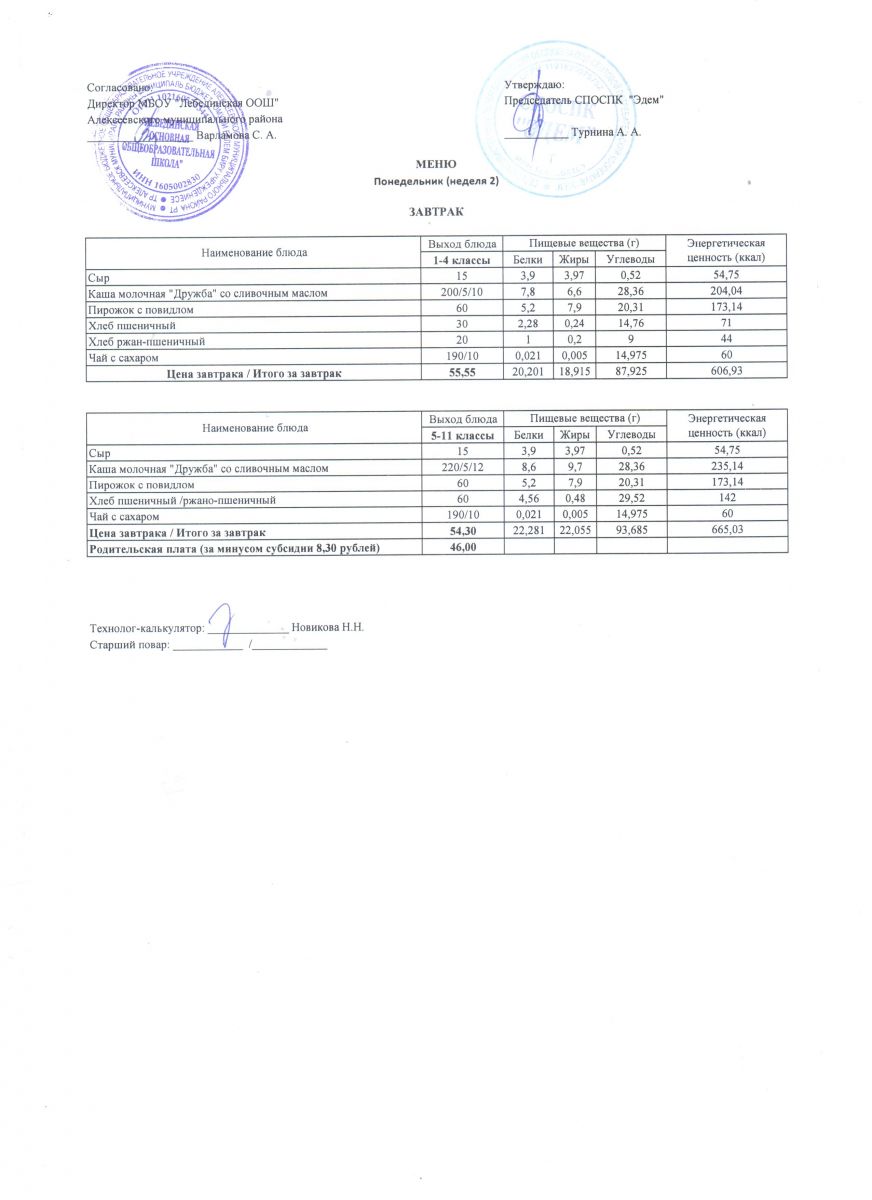 Меню по школьной столовой на понедельник 1 неделя 2021.