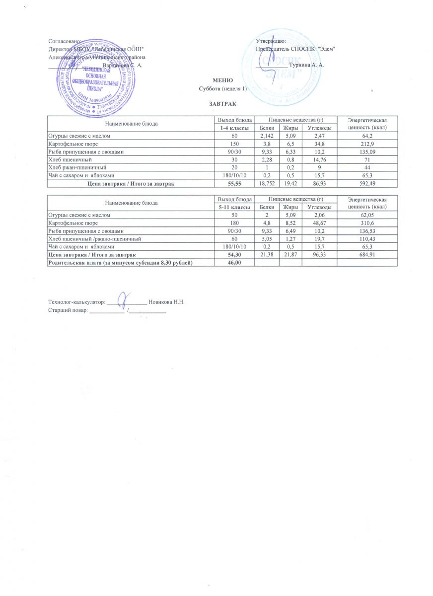 Меню по школьной столовой на 2022г суббота 1 неделя.