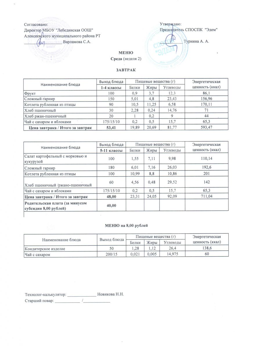 Меню по школьной столовой на 2022г суббота 2 неделя