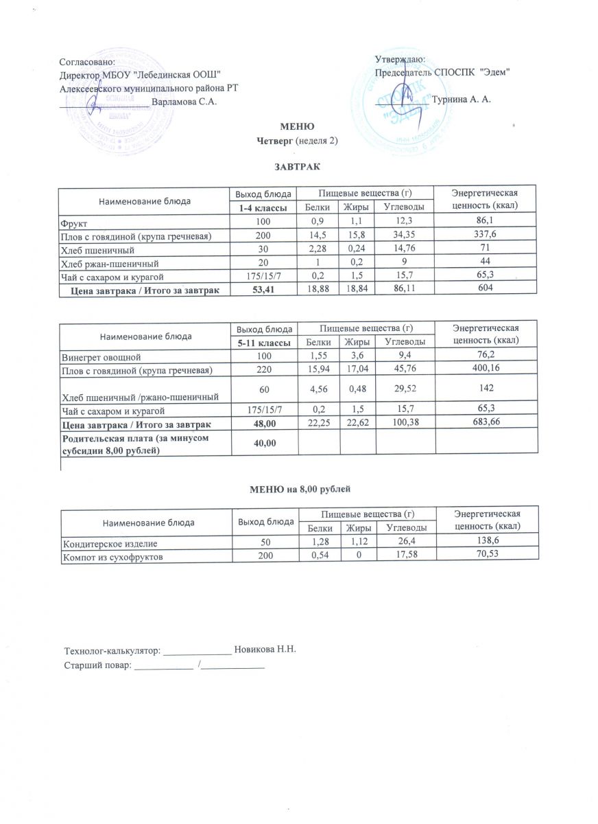Меню по школьной столовой на 2022г четверг 2 неделя