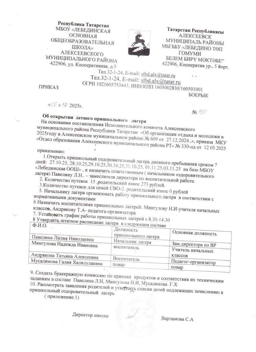 Приказ на открытие пришкольно-оздоровительного лагеря в период осенних каникул