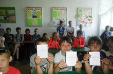 После обеда весело отдыхали: играли в футбол, волейбол, смотрели мультфильмы. Потом все дружно вышли к школе, чтобы отметить День России красивой надписью на асфальте.
