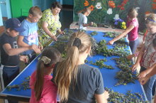 Сегодня день в пришкольном лагере "Муравей" был посвящён уборке территории, прополке и поливу цветника. Дети после работы собирали пазлы, играли в "Колечко", "Выше ноги от земли", "Кот, кот какая сметана", "Футбол". После вкусного обеда был проведён конкурс рисунков "Краски лета" Победила дружба.